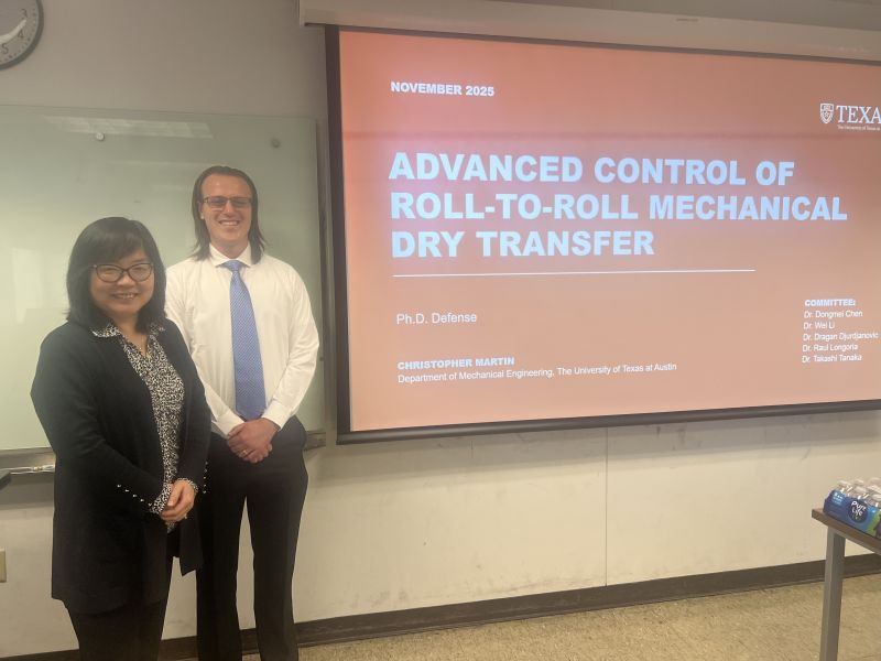 Congratulations to Chris and Dr. Chen! Their paper, "Nonlinear Model Predictive Control for Roll-to-Roll Mechanical Transfer of Printed Electronics and 2D Materials", has been accepted for presentation at the American Control Conference (ACC) 2025 in Denver. The work introduces a fast, accurate nonlinear model and MPC framework for precise control of roll-to-roll (R2R) mechanical peeling—an advanced technology enabling continuous, etchant-free transfer of printed electronics and 2D materials. A case study on CVD graphene dry transfer highlights the approach’s effectiveness in managing nonlinear dynamics and constraints for high-quality manufacturing.